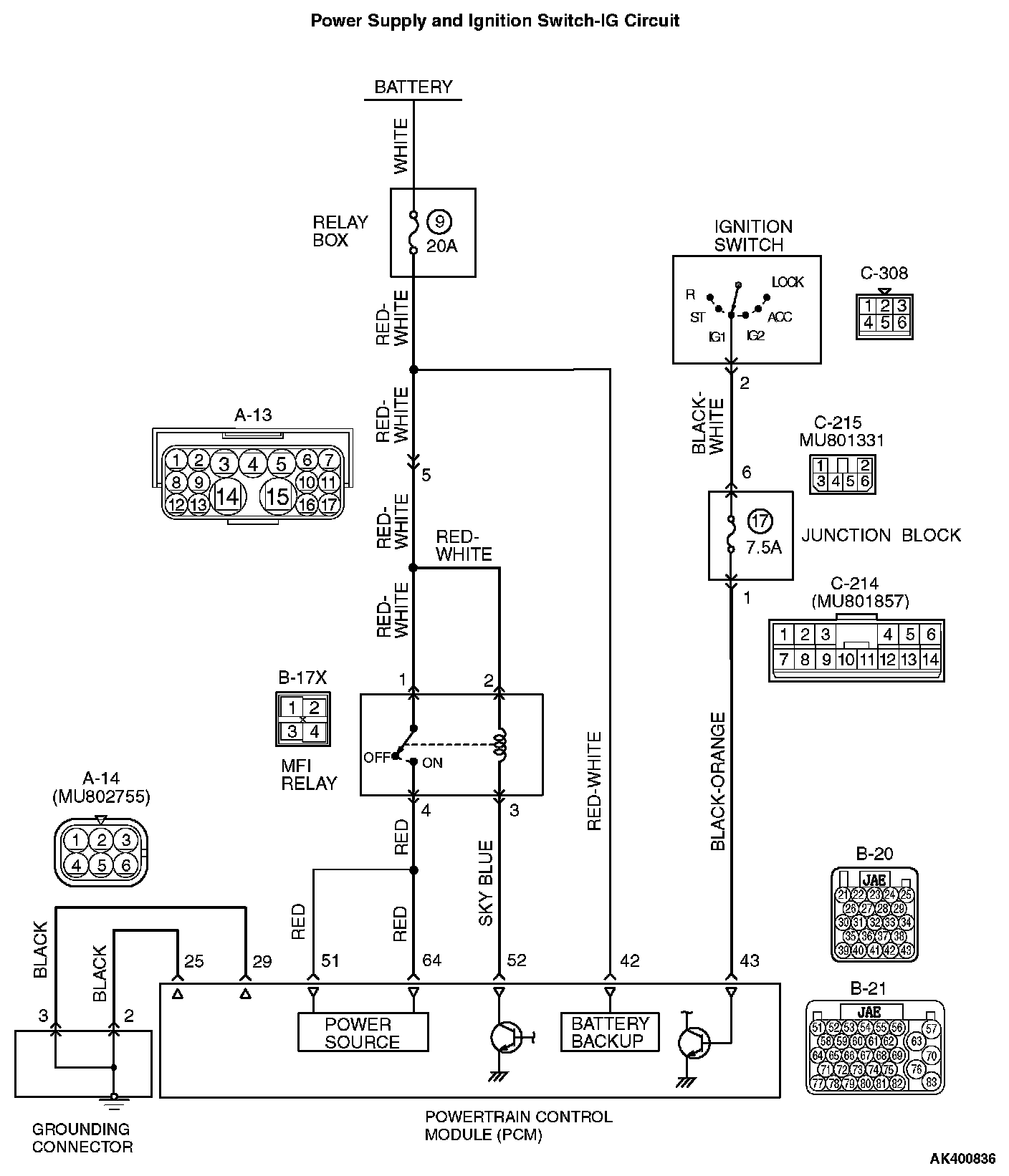 - When the ignition switch is turned to the "ON" position, battery positive voltage is applied to the PCM (terminal No. 43). When battery positive voltage is applied, the PCM turns the power transistor in the PCM "ON" and grounds the MFI relay coil. With this, the MFI relay turns "ON" the battery positive voltage is supplied to the PCM (terminals No. 51, No. 64) from the MFI relay (terminal No. 4).