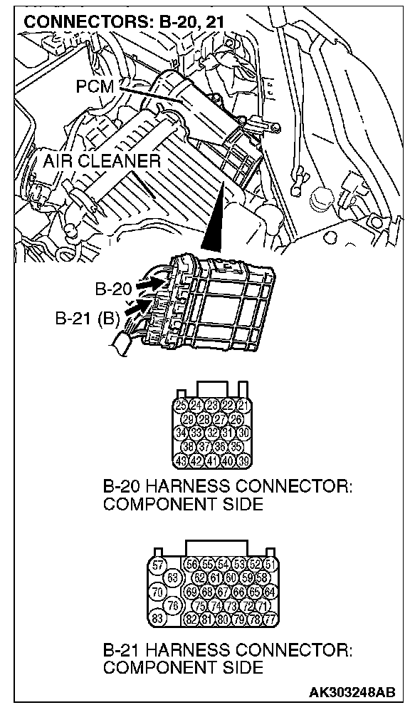 STEP 4. Check harness connector B-20 and B-21 at PCM for damage.
