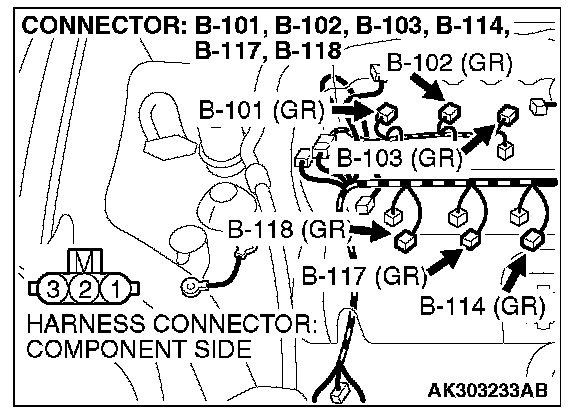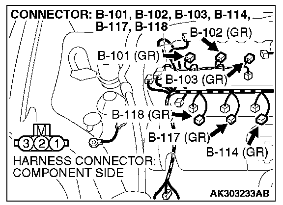 STEP 4. Check the circuit at ignition coil harness side connectors B-101, B-102, B-103, B-114, B-117, B-118.