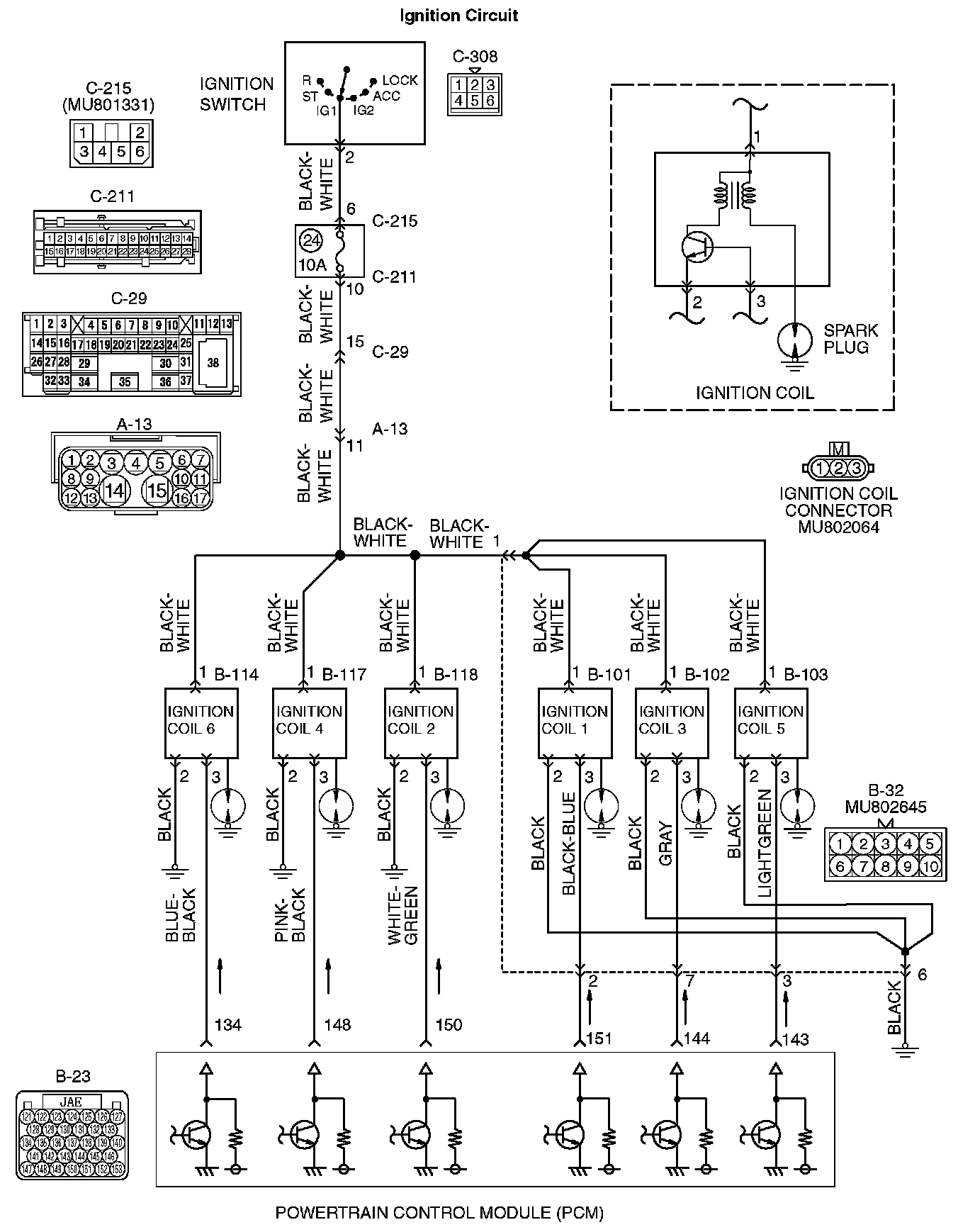 - When the PCM turns off its internal power transistor, battery positive voltage is applied to the ignition power transistor (terminal No. 3) inside the ignition coil, causing the ignition power transistor to be turned on.