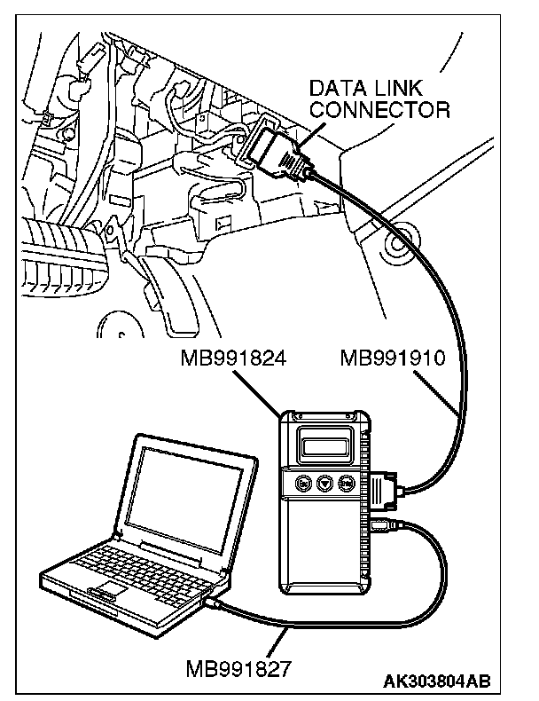 CAUTION: To prevent damage to scan tool MB991958, always turn the ignition switch to the "LOCK" (OFF) position before connecting or disconnecting scan tool MB991958.