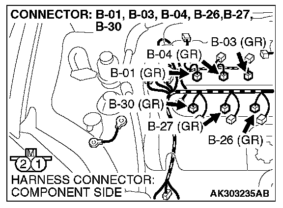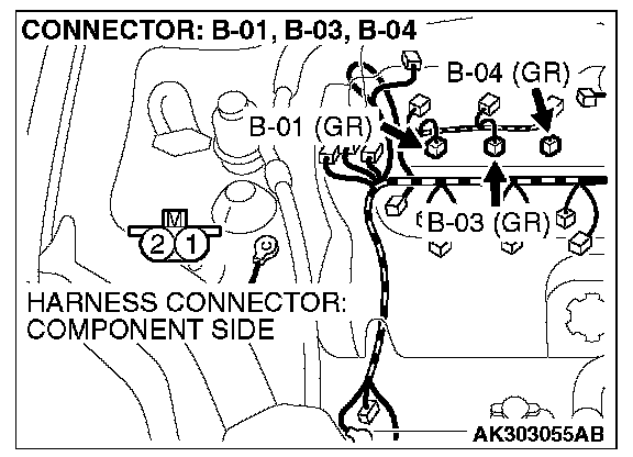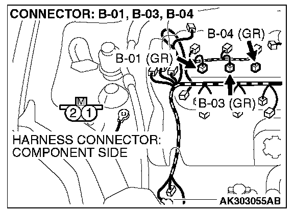 STEP 11. Check harness connector B-01 or B-03 or B-04 at right bank injector for damage.