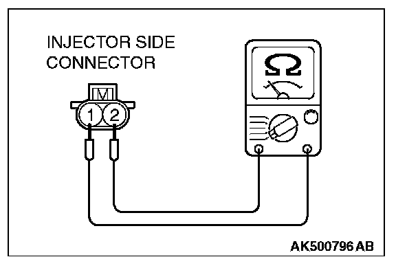 3. Measure the resistance between injector side connector terminal No. 1 and No. 2.