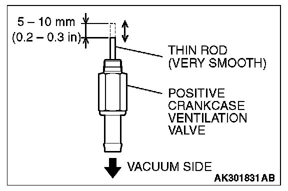 POSITIVE CRANKCASE VENTILATION VALVE CHECK1. Hold the positive crankcase ventilation (PCV) valve with the vacuum side down. Insert a thin rod, and using light pressure, depress the end of the PCV valve spring by 5 - 10 mm (0.2 - 0.3 inch). Release pressure on the rod to see if the PCV valve spring will lift the rod to its original position.
