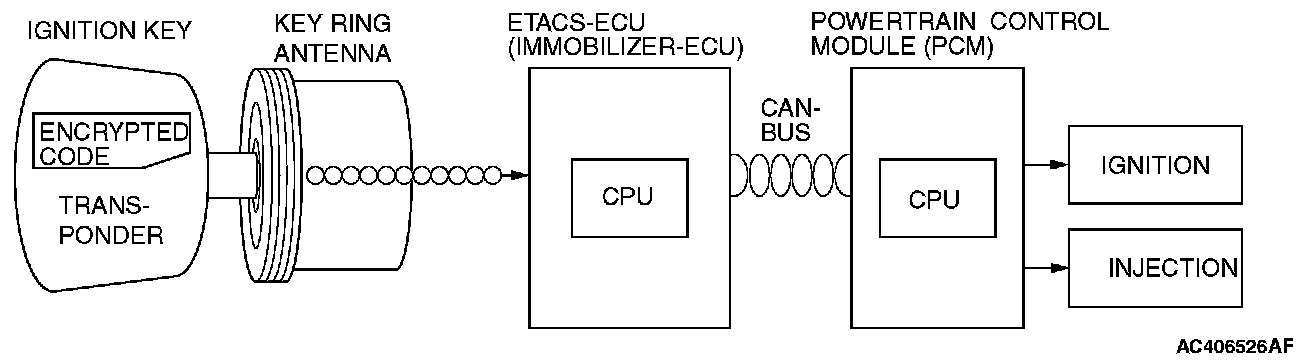 The engine immobilizer system prevents the engine from starting and immobilizes the vehicle if a key other than the key registered for that vehicle is used in an attempt to start the engine after forced entry The engine immobilizer system consists of the ignition key, the key ring antenna, the ETACS-ECU (immobilizer-ECU), and the powertrain control module (PCM) It has these functions:
