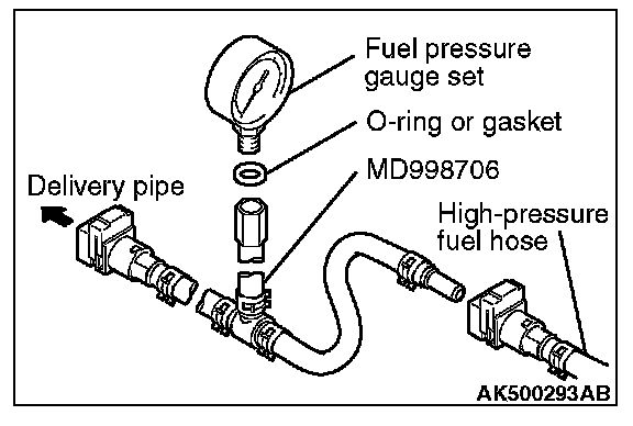 1. Via a gasket, install the special tool MB991637 (fuel pressure gauge set) into the special tool that has already assembled as described.