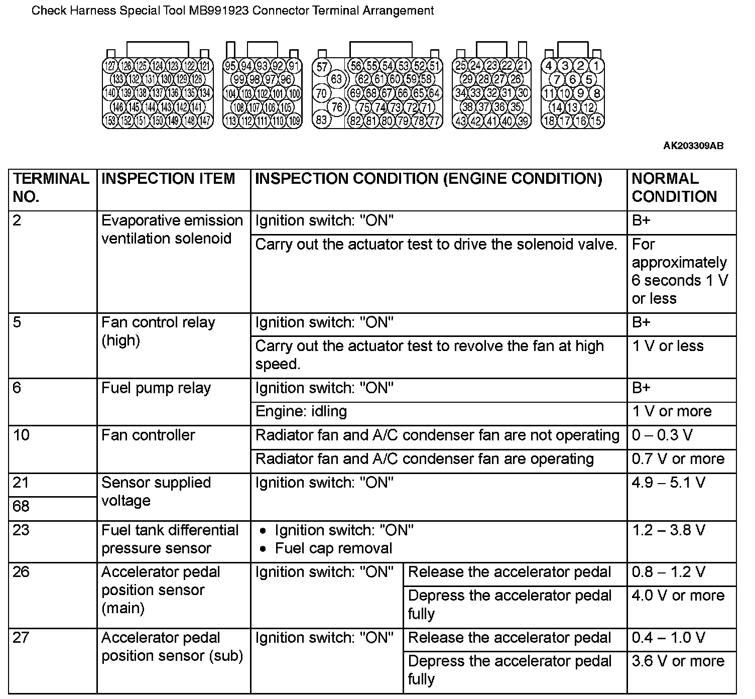 Check Harness Special Tool MB991923 Connector Terminal Arrangement Part 1: