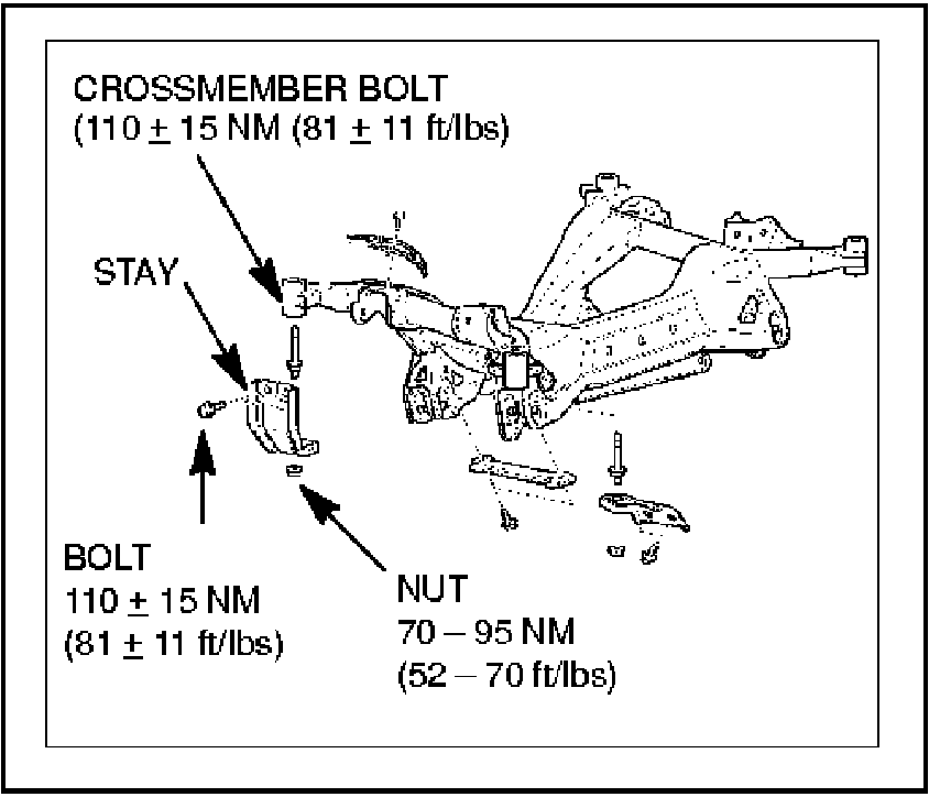 b. Ensure the crossmember bolt is tightened to 110 + 15 Nm (81 + 11 ft./lbs).