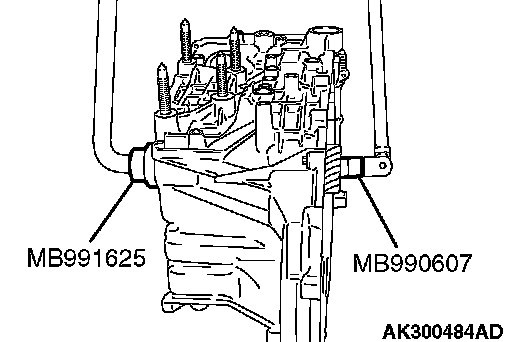 25. Apply ATF to a new jam nut, and use special tools MB990607 and MB991625 to tighten the jam nut to the specified torque. Then turn back one turn, and tighten to the specified torque again.