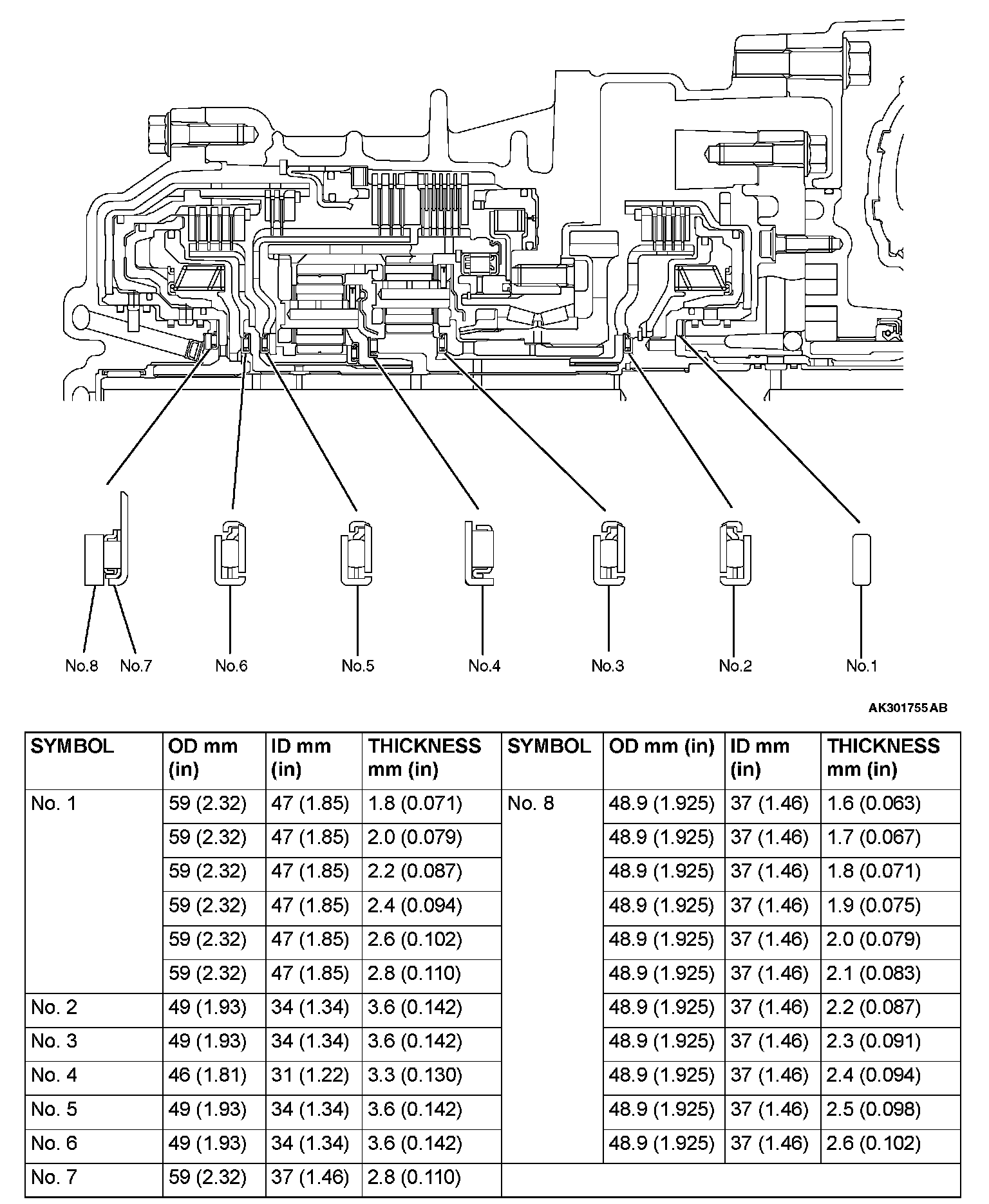 1. Install the thinnest thrust race number 8 [thickness 1.6 mm (0.063 inch); part number MD707267] on thrust bearing number 7.
