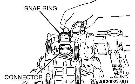 91. Insert the solenoid valve harness connector into the hole from the inside of the transaxle case so it is oriented as shown in the illustration. Then secure the snap ring to the connector groove.