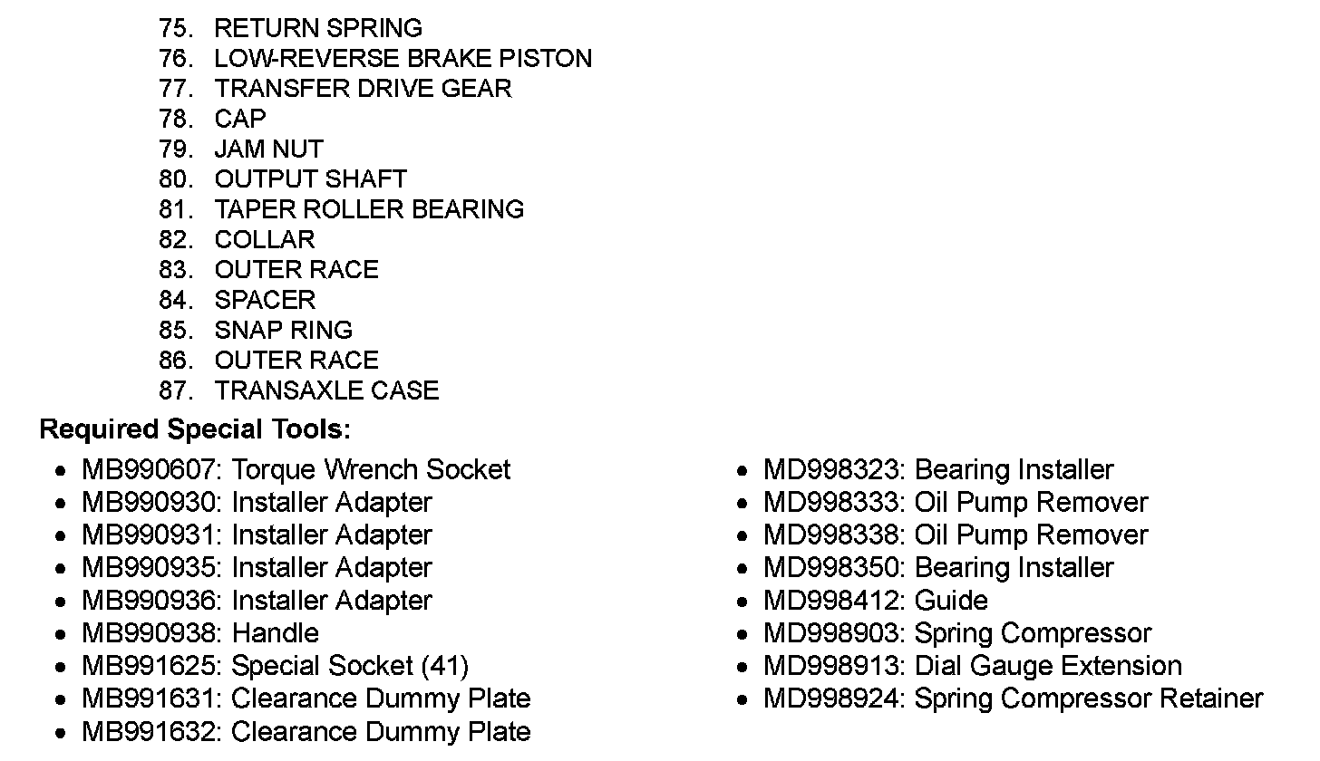 58. Use special tools MB991625 and MB990607 to remove the output shaft jam nut.