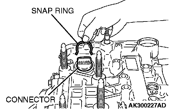 15. Remove the snap ring from the connector. Push the connector into the transaxle case and remove the solenoid valve harness.