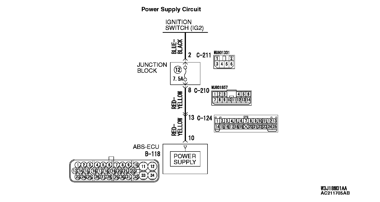 The wire between ABS-ECU connector B-118 (terminal 10) and junction block connector C-211 (terminal 2)
