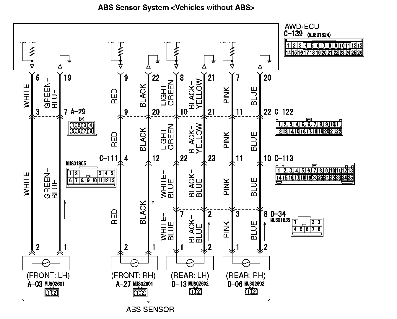 STEP 5. Check the harness for open circuit or short circuit to ground between ABS sensor connector A-03 (terminals 1, 2), A-27 (terminals 1, 2), D-06 (terminals 1, 2), D-13 (terminals 1, 2) and AWD-ECU connector C-139 (terminals 6, 19, 9, 22, 7, 20, 8, 21).