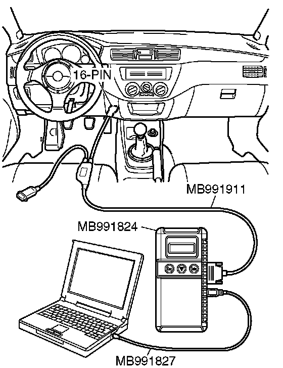 CAUTION: To prevent damage to scan tool MB991958, always turn the ignition switch to the LOCK (OFF) position before connecting or disconnecting scan tool MB991958.