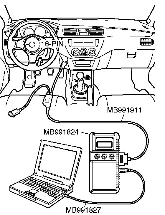 CAUTION: To prevent damage to scan tool MB991958, always turn the ignition switch to the LOCK (OFF) position before connecting or disconnecting scan tool MB991958.