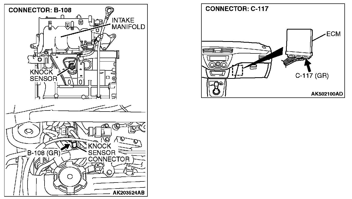 STEP 4. Check for open circuit and short circuit to ground and harness damage between knock sensor connector B-108 (terminal No.1) and ECM connector C-117 (terminal No.91).
