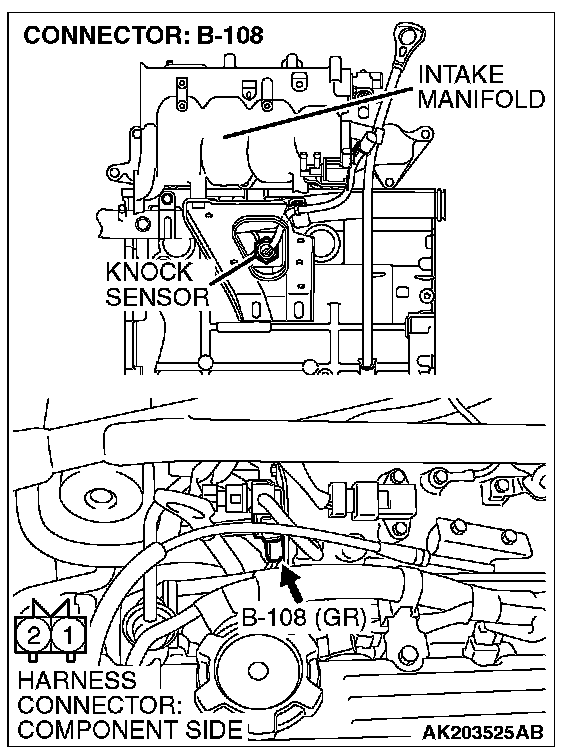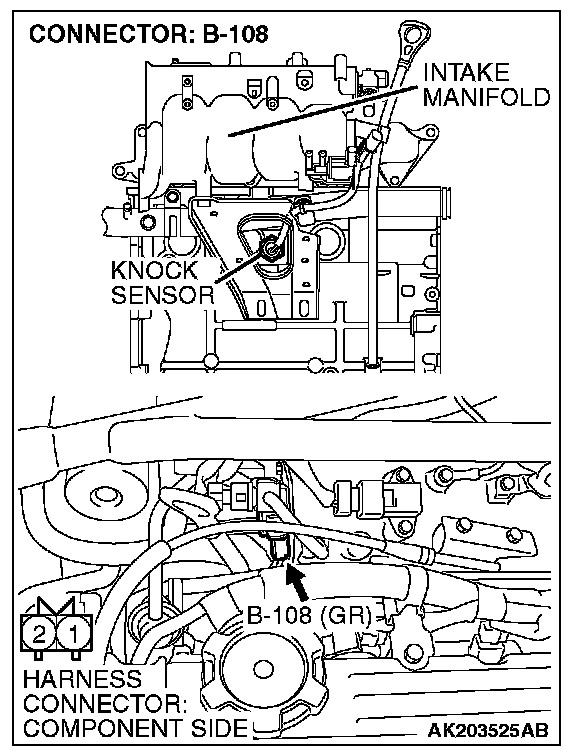 STEP 1. Check harness connector B-108 at the knock sensor for damage.