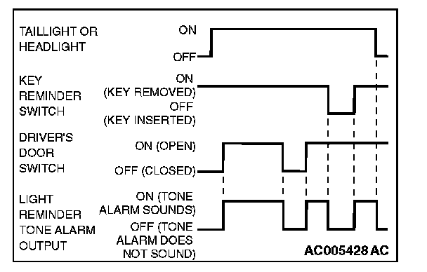 - Sounds the tone alarm 12 cycles (after 0.48 seconds) if any of the following conditions is met when 60 seconds or more have elapsed since the ignition switch is turned "ON". One cycle consists of 5 seconds "on" and then 2.8 seconds "off".