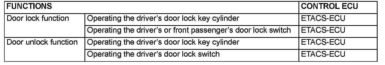 When the transmitter unlock button is pressed once, the ETACS-ECU energizes its door unlock relay to operate the door lock actuator of the driver's door for 0.25 second thus causing only the driver's door to be unlocked.