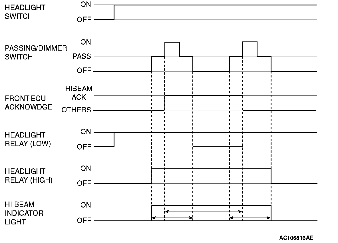 The front ECU lights up the headlight (LOW) when the signal from the column switch to the headlight switch is in the "ON" state and the built-in head light relay (LOW) is in the ON state. If the dimmer switch is turned on while the headlight relay (LOW) is on, the front-ECU turns on the headlight relay (HIGH), causing the high-beam headlights to illuminate.