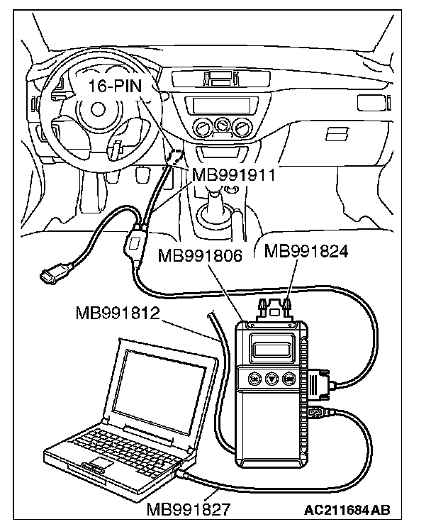 CAUTION: To prevent damage to scan tool MB991958, always turn the ignition switch to the "LOCK" (OFF) position before connecting or disconnecting scan tool MB991958. Connect special tool MB991911 before connecting special tool MB991812. Be sure to connect special tool MB991806 after turning on special tool MB991824.