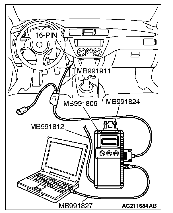 CAUTION: To prevent damage to scan tool MB991958, always turn the ignition switch to the "LOCK" (OFF) position before connecting or disconnecting scan tool MB991958. Connect special tool MB991911 before connecting special tool MB991812. Be sure to connect special tool MB991806 after turning on special tool MB991824.