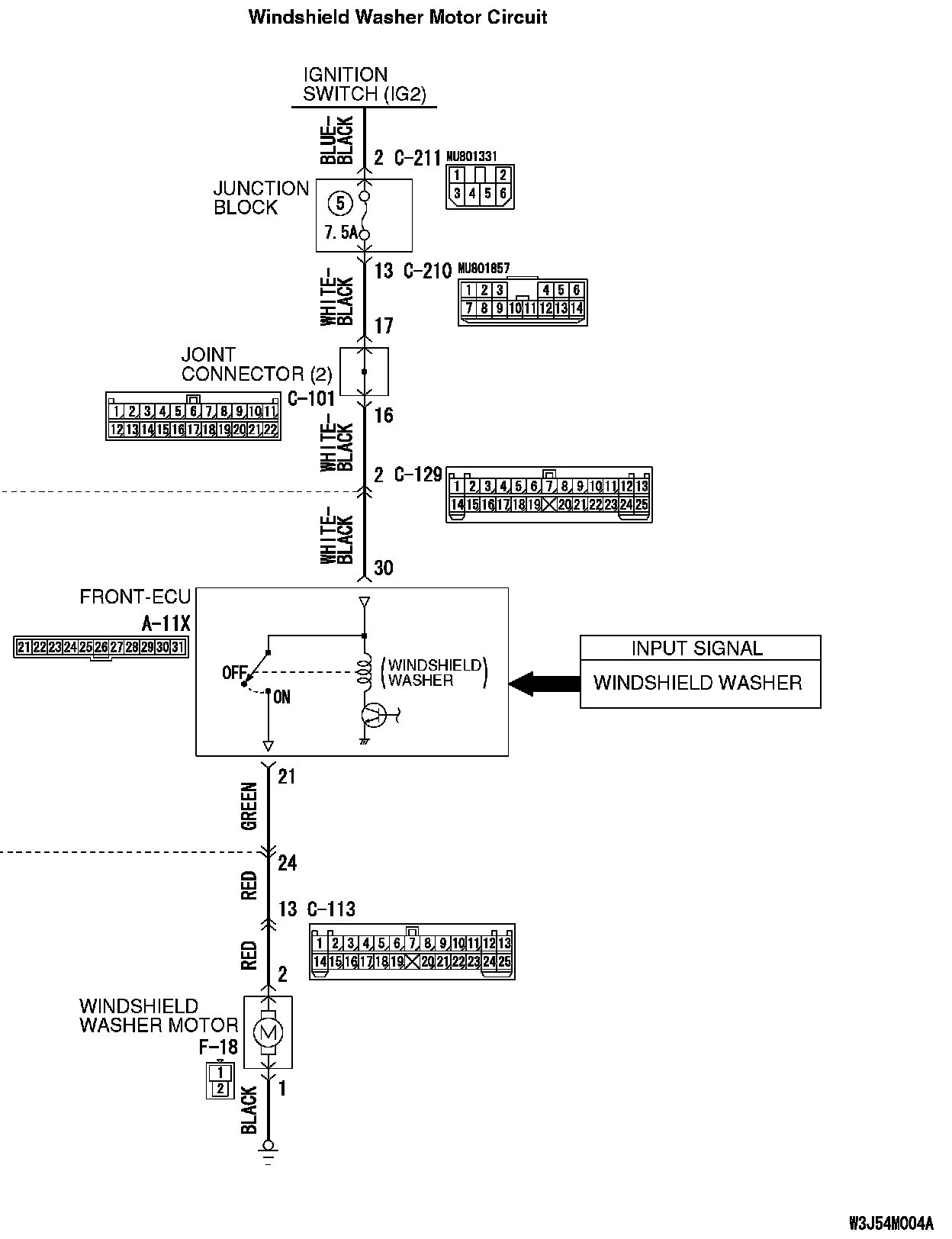 The windshield washer switch sends a signal through the column-ECU (incorporated in the column switch) to the front-ECU. If the column-ECU sends a windshield washer switch "ON" signal to the front-ECU, the front-ECU turns on the relay (incorporated in the front-ECU), thus causing the windshield washer motor to be turned on.