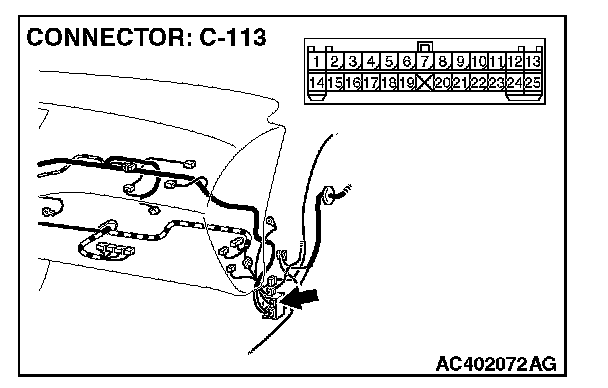 NOTE: Also check intermediate connector C-113 for loose, corroded, or damaged terminals, or terminals pushed back in the connector. If intermediate connectors C-113 is damaged, repair or replace the damaged components) as described in Harness Connector Inspection.
