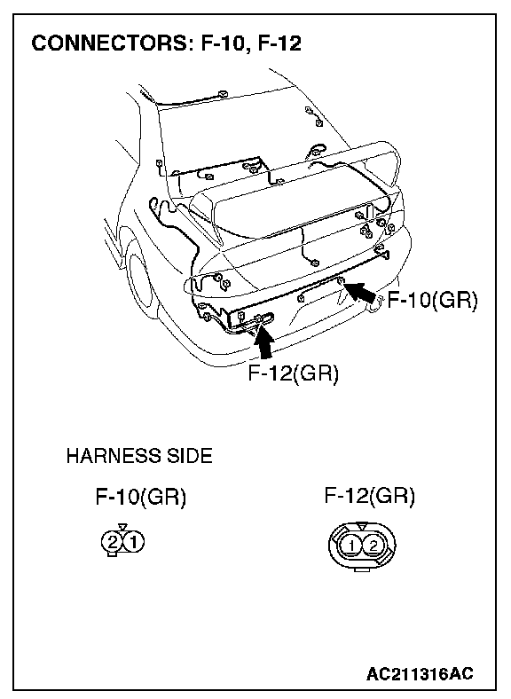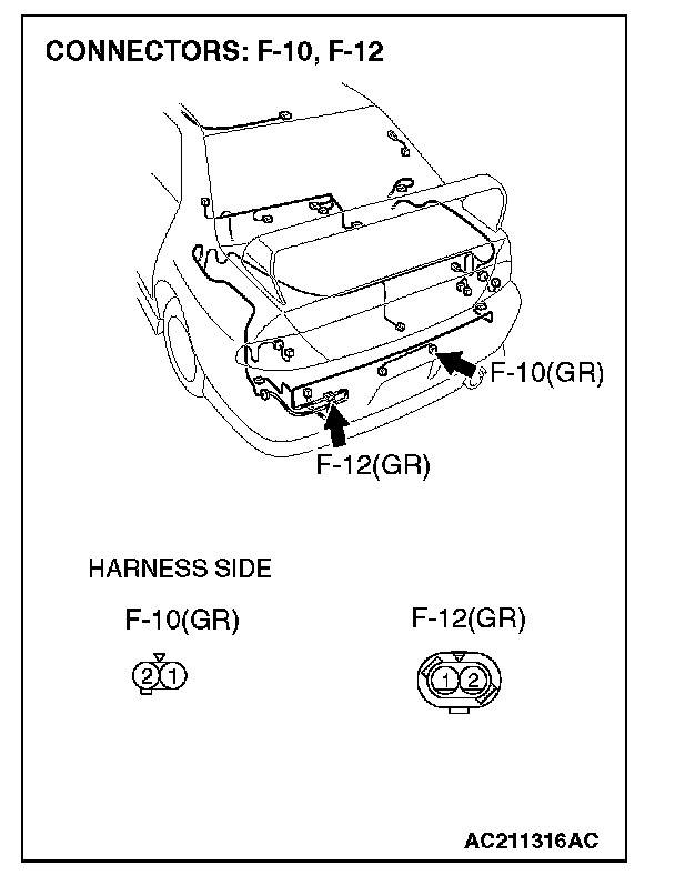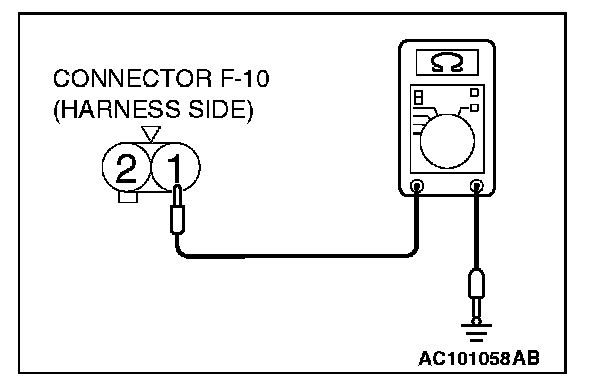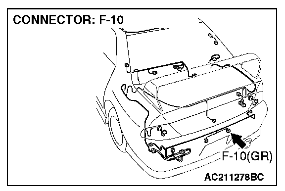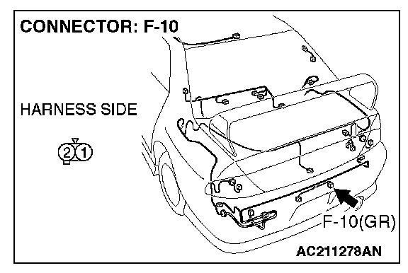 1. Disconnect license plate light (RH) connector F-10 and measure the resistance available at the wiring harness side of the connector.