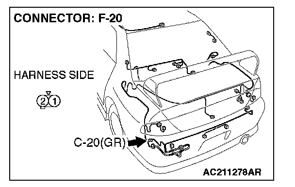 1. Disconnect rear side marker light (LH) connector F-20 and measure the resistance available at the wiring harness side of the connector.
