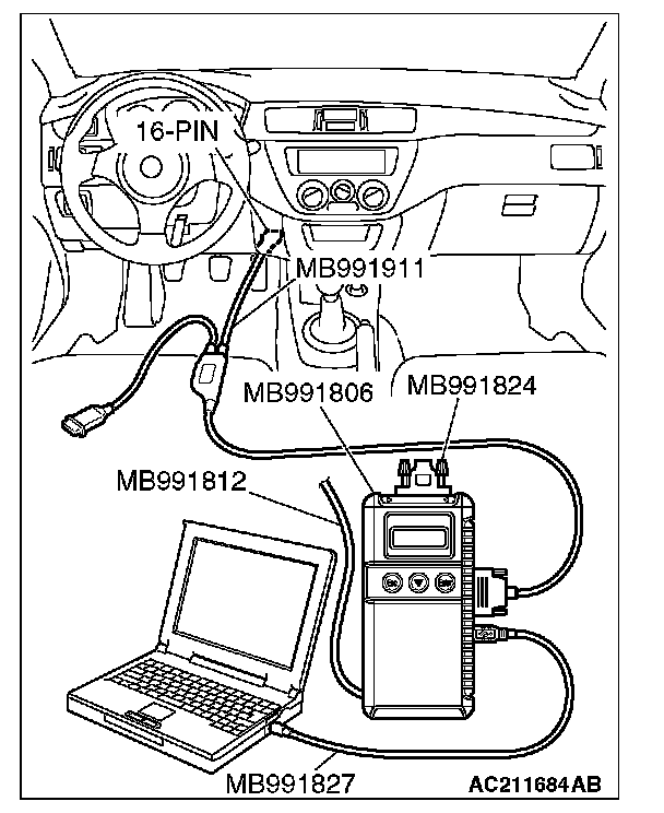 CAUTION: To prevent damage to scan tool MB991958, always turn the ignition switch to the "LOCK" (OFF) position before connecting or disconnecting scan tool MB991958. Connect special tool MB991911 before connecting special tool MB991812. Be sure to connect special tool MB991806 after turning on special tool MB991824.