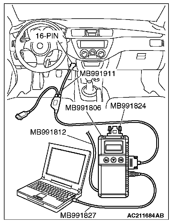 CAUTION: To prevent damage to scan tool MB991958, always turn the ignition switch to the "LOCK" (OFF) position before connecting or disconnecting scan tool MB991958. Connect special tool MB991911 before connecting special tool MB991812. Be sure to connect special tool MB991806 after turning on special tool MB991824.