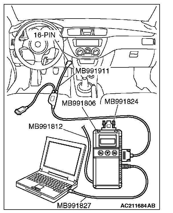 CAUTION: To prevent damage to scan tool MB991958, always turn the ignition switch to the "LOCK" (OFF) position before connecting or disconnecting scan tool MB991958. Connect special tool MB991911 before connecting special tool MB991812. Be sure to connect special tool MB991806 after turning on special tool MB991824.