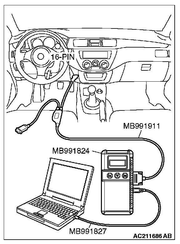 CAUTION: To prevent damage to scan tool MB991958, always turn the ignition switch to the "LOCK" (OFF) position before connecting or disconnecting scan tool MB991958.