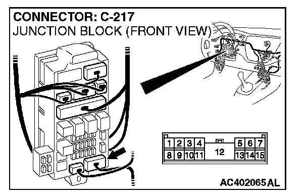 NOTE: Also check junction block connector C-217 for loose, corroded, or damaged terminals, or terminals pushed back in the connector. If junction block connector C-217 is damaged, Repair or replace the damaged components) as described in Harness Connector Inspection.