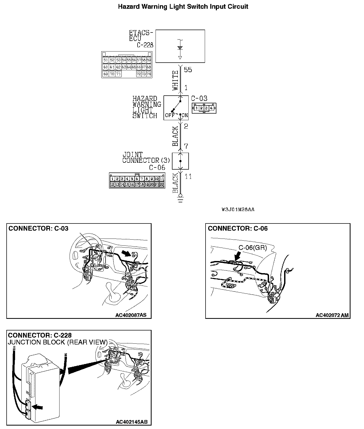 STEP 6. Check the wiring harness between hazard warning light switch connector C-03 (terminal 1) and ETACS-ECU connector C-228 (terminal 55).