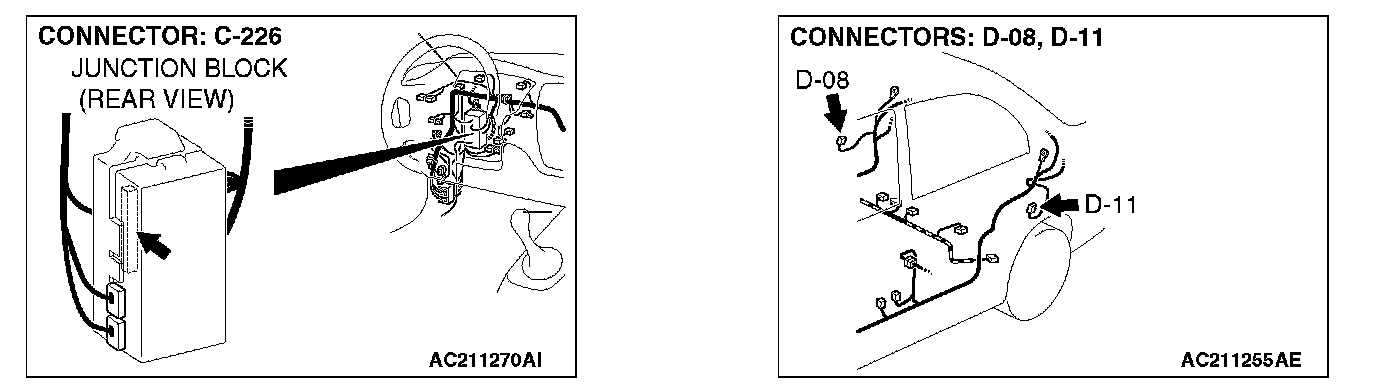 STEP 11. Check the wiring harness between door switch (rear: RH) connector D-08 (terminal 2) and ETACS-ECU connector C-226 (terminal 7).