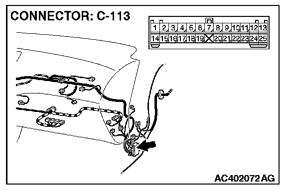 NOTE: Also check intermediate connector C-113 and junction block connector C-214 for loose, corroded, or damaged terminals, or terminals pushed back in the connector. If intermediate connector C-113 or junction block connector C-214 is damaged, Repair or replace the damaged components) as described in Harness Connector Inspection.