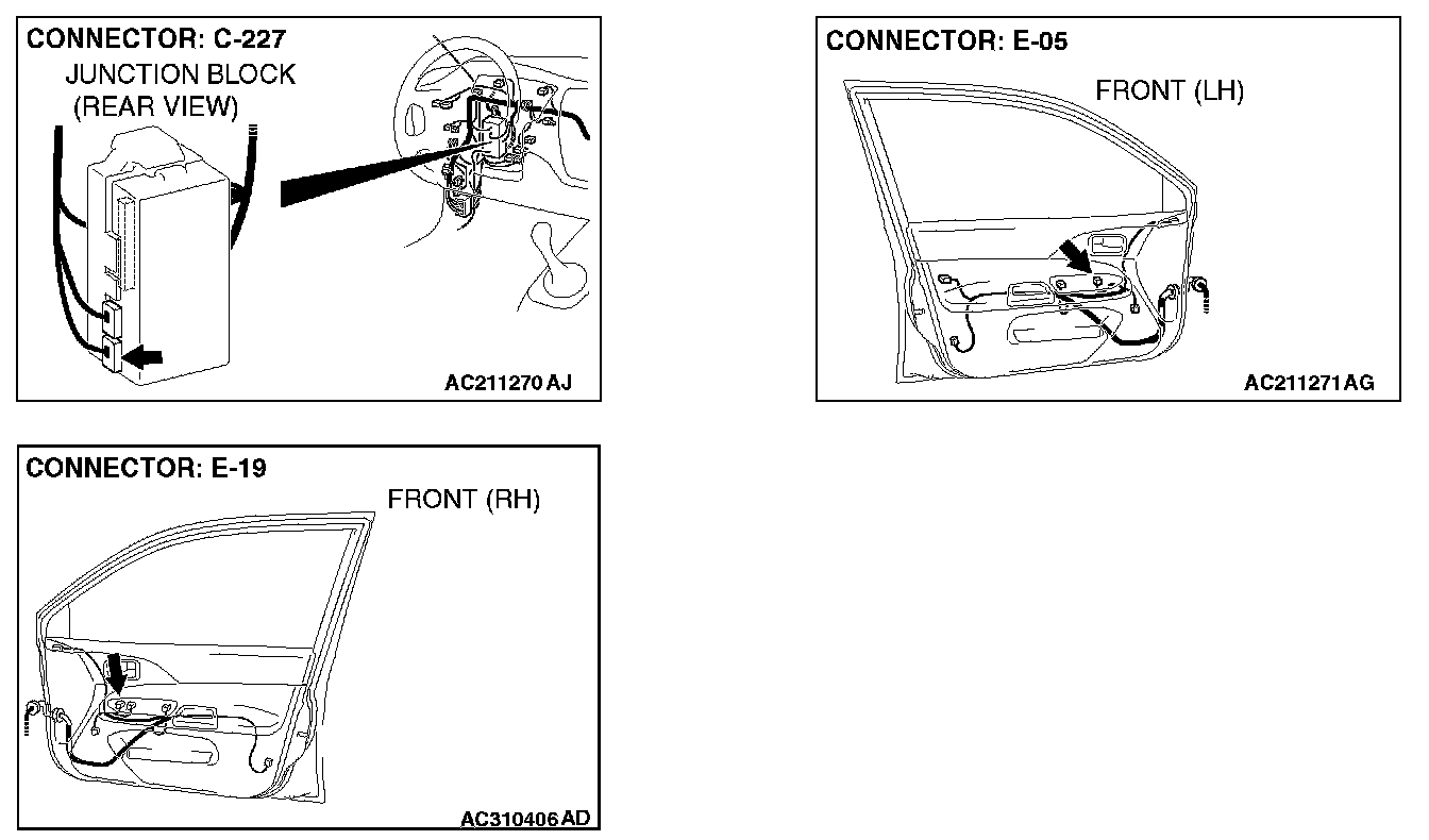 STEP 7. Check the wiring harness between power window main switch connector E-05 (terminal 5 and 13) and ETACS-ECU connector C-227 (terminal 42 and 34).