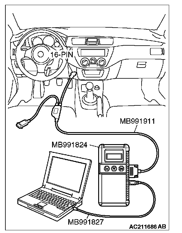 CAUTION: To prevent damage to scan tool MB991958, always turn the ignition switch to the "LOCK" (OFF) position before connecting or disconnecting scan tool MB991958.
