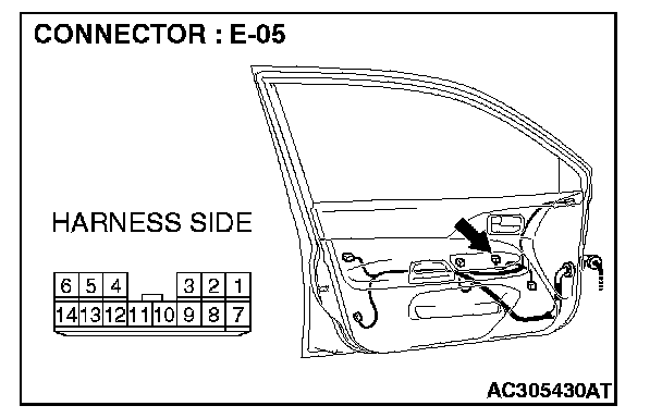 STEP 2. Check power window main switch connector E-05 for loose, corroded or damaged terminals, or terminals pushed back in the connector.