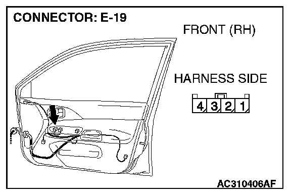 1. Disconnect power window sub switch connector E-19 and measure the resistance available at the wiring harness side of the connector.