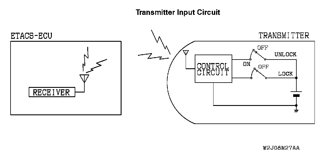 Transmitter: The ETACS-ECU does not receive any signal from the lock or unlock switch.Transmitter Input Circuit: