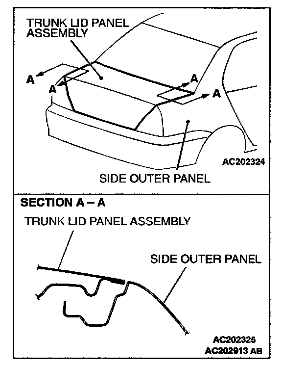 3. If there is a difference in height between the side outer panels and the side edges of the trunk lid panel assembly, check the trunk lid hinges and, if necessary, replace them.