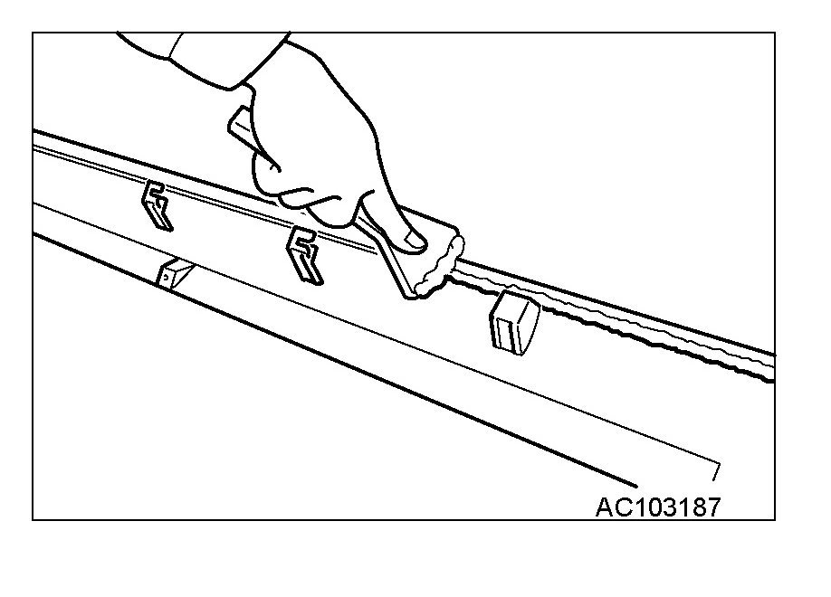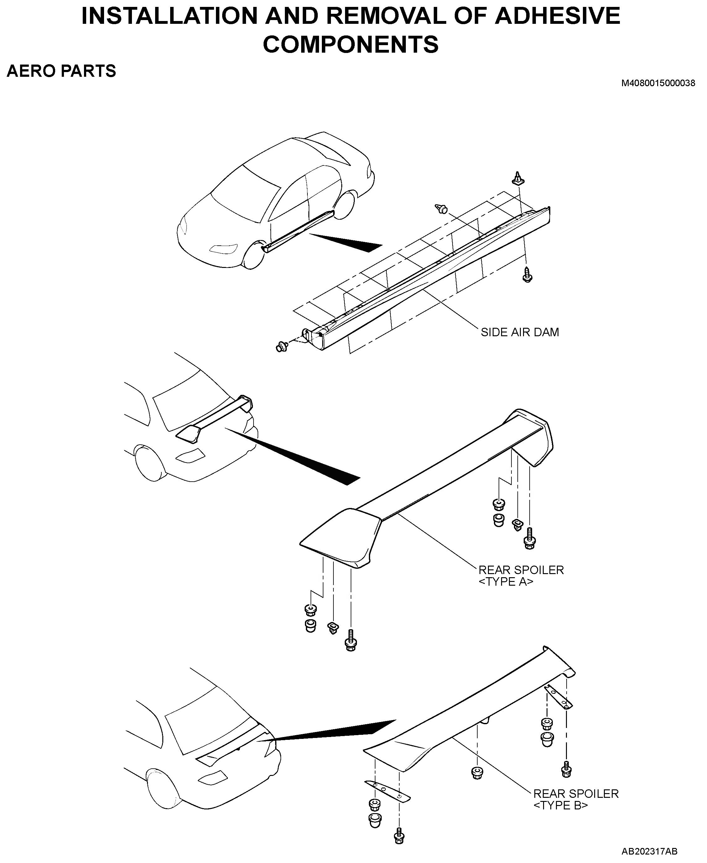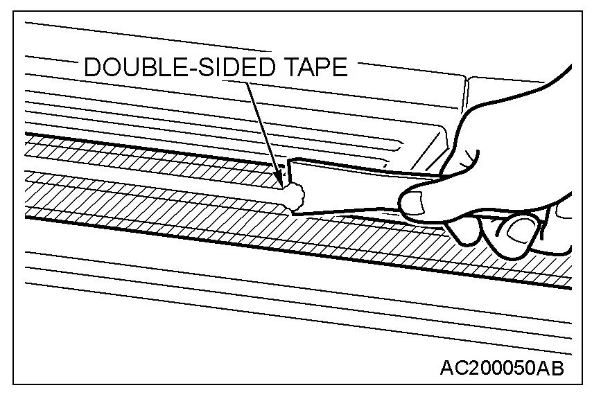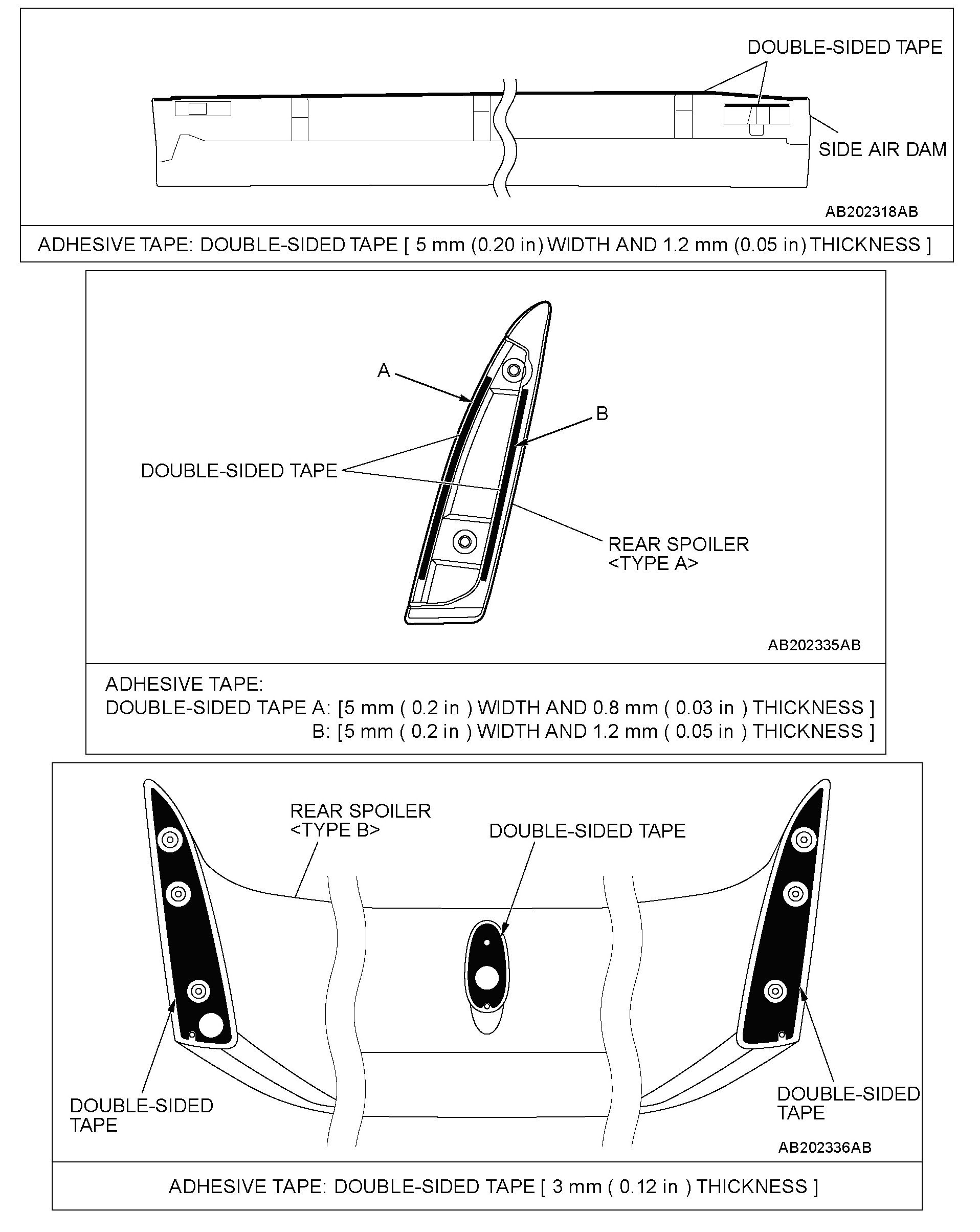 NOTE: If the double-sided tape is difficult to affix in cold temperature, etc., warm the bonding surfaces of the body and side air dam to about 40 -60 degrees C (104 - 140 degrees F) before affixing the tape.