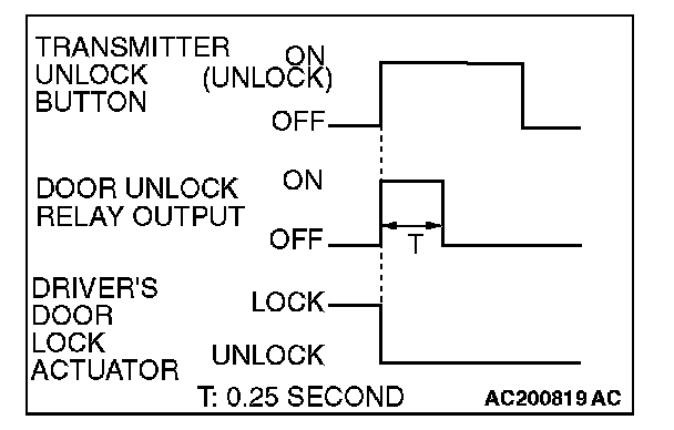 When the transmitter unlock button is pressed twice, the ETACS-ECU energizes its door unlock relay to operate the driver's door lock actuator and the other door lock actuators for 0.25 second each in succession. Then, the doors will be unlocked.