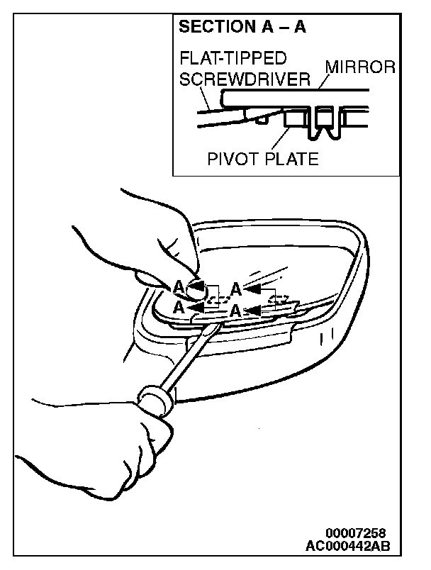 Push the top of the mirror with your hand to tilt it and attach the protective tape as shown in the illustration. Then insert a flat-tipped screwdriver in between the notch at the rear of the mirror and the pivot plate and disengage the bottom of the mirror.