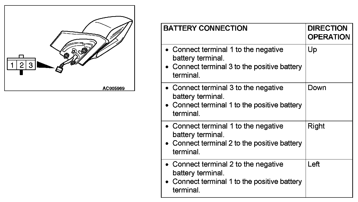 Check that the mirror moves as described in the table when each terminal is connected to the battery